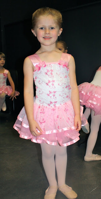 Thankfully her hair stayed during the recital. It wasn't long enough for a bun, but we pulled it back with a french braid and lots and lots of hairspray! It gradually fell throughout the evening!